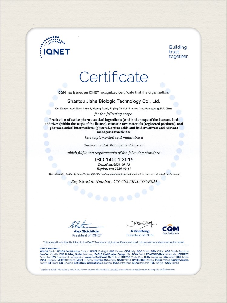 汕頭佳禾生物科技有限公司是一家致力于氨基酸及其衍生物研發(fā)、生產(chǎn)和銷售的國家高新技術(shù)企業(yè),先后通過了國家藥品GMP認(rèn)證,ISO9001質(zhì)量體系認(rèn)證、ISO14001環(huán)境管理體系認(rèn)證。目前,公司擁有“廣東省專精特新中小企業(yè)”、“廣東省氨基酸產(chǎn)品工程技術(shù)研究中心”、“汕頭市生物發(fā)酵工程技術(shù)研究開發(fā)中心”、“汕頭市知識(shí)產(chǎn)權(quán)優(yōu)勢(shì)企業(yè)”、“多項(xiàng)國家發(fā)明專利”、“廣東省守合同重信用企業(yè)”等多項(xiàng)資質(zhì)和榮譽(yù),旗下“佳禾牌”系列產(chǎn)品已成為原料藥行業(yè)知名品牌。 新泰市佳禾生物科技有限公司成立于2012年8月,注冊(cè)資金2億元,公司位于山東泰安新泰市新汶工業(yè)園區(qū),是國 家級(jí)高新技術(shù)企業(yè)、山東省“專精特新”企業(yè)、山東省制造業(yè)單項(xiàng)冠軍企業(yè)、泰安市科技型中小企業(yè)、泰安市農(nóng)業(yè)產(chǎn)業(yè)化龍頭企業(yè)、中國生物發(fā)酵產(chǎn)業(yè)協(xié)會(huì)理事單位。
